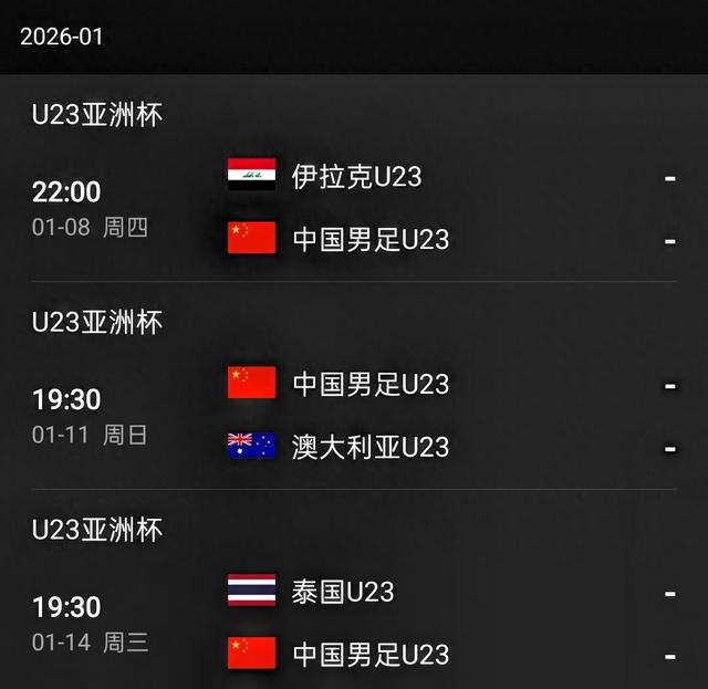 据了解,2026年U23亚洲杯决赛阶段将于2026年1月7日至25日在沙特阿拉伯举行。共有16支球队参加这项比赛,中国U23男足与澳大利亚U23、伊拉克U23、泰国U23同分在D组。根据最新的赛程安排,2026年中国男足首战已经出炉!中国队将在北京时间2026年1月8日晚22点,迎来对阵伊拉克U23的对决。